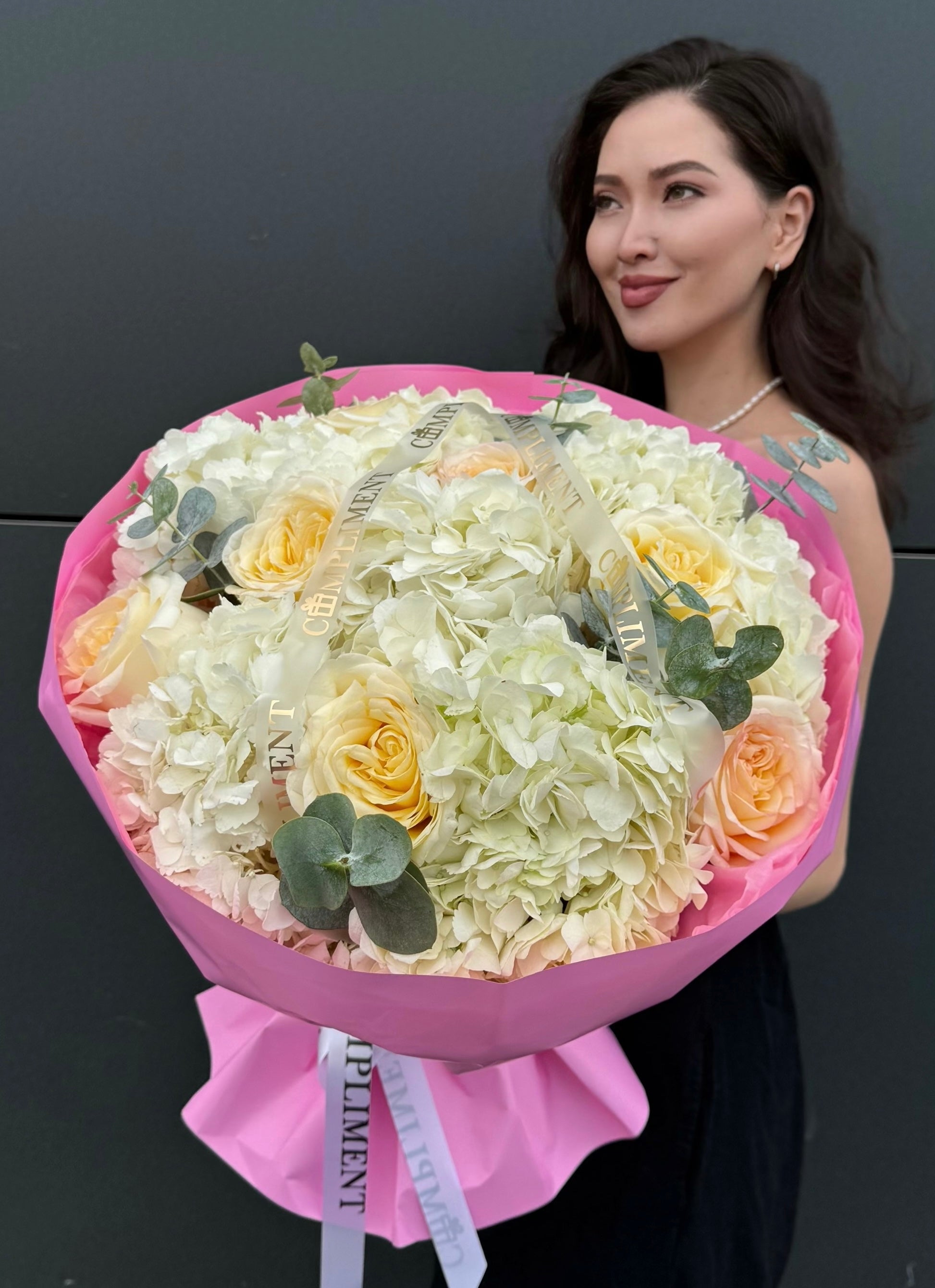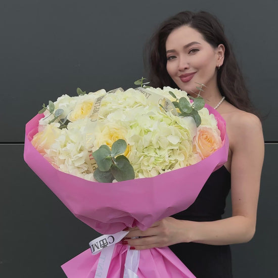 Bouquet Candelight , size :S . 7 white hydrangeas, 7 white garden roses &5 eucalyptus