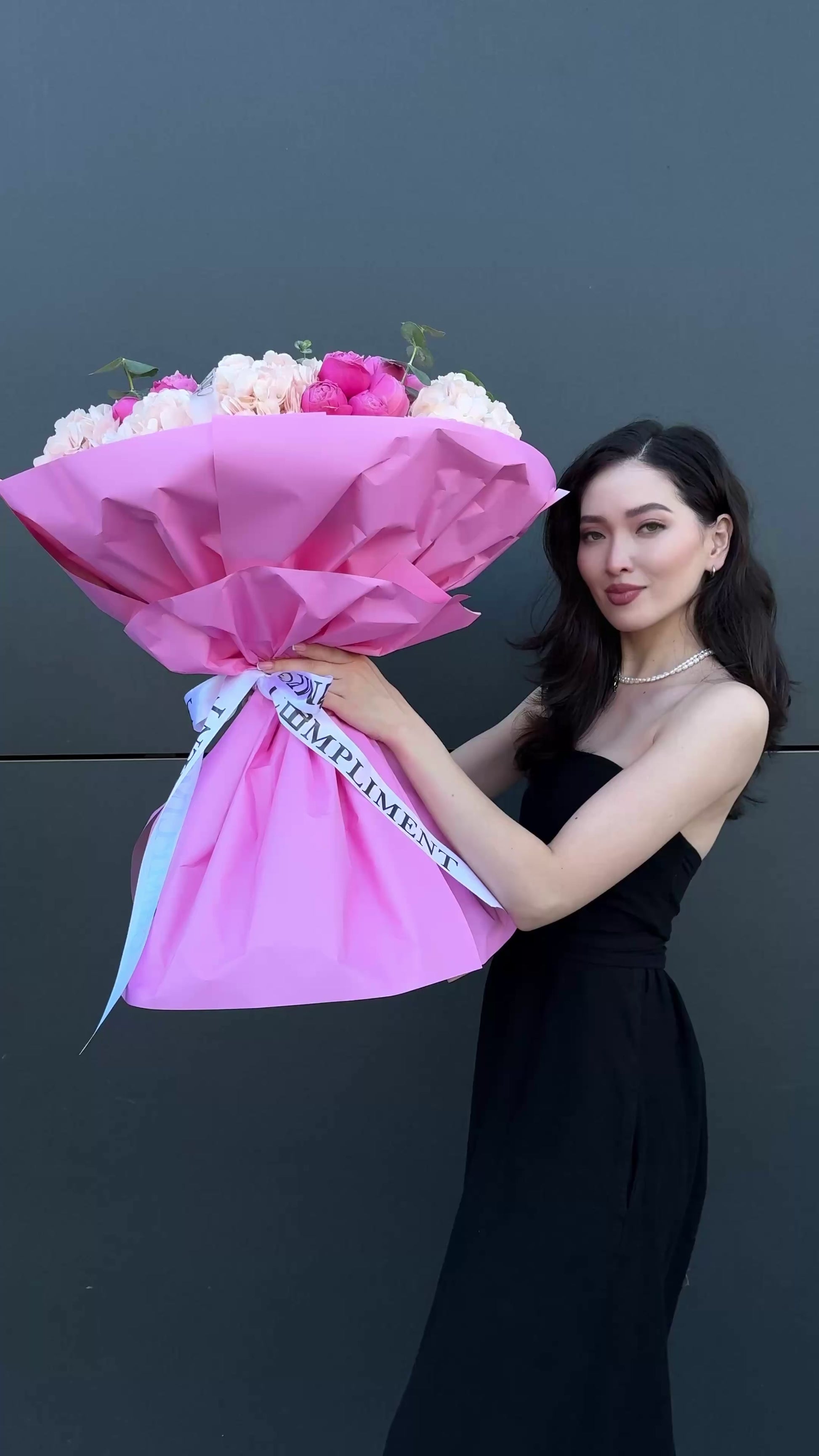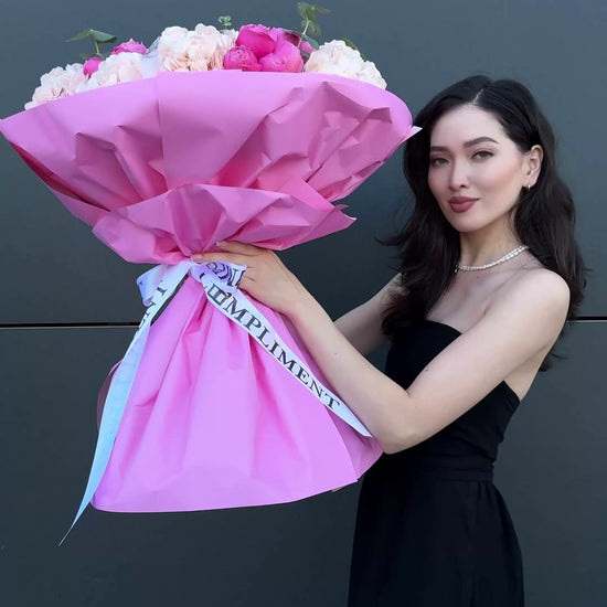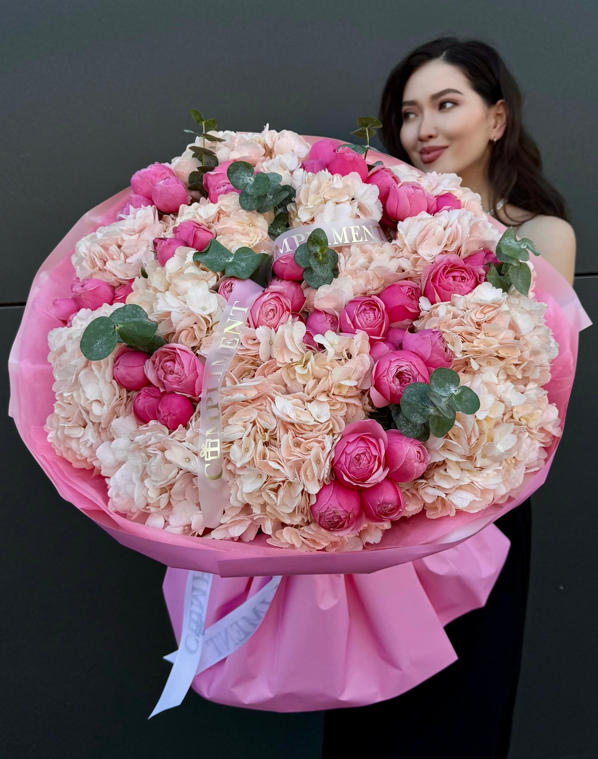 Bouquet “BARBIE” size :M. 15 pink hydrangeas , 11 pink peony spray roses & eucalythus