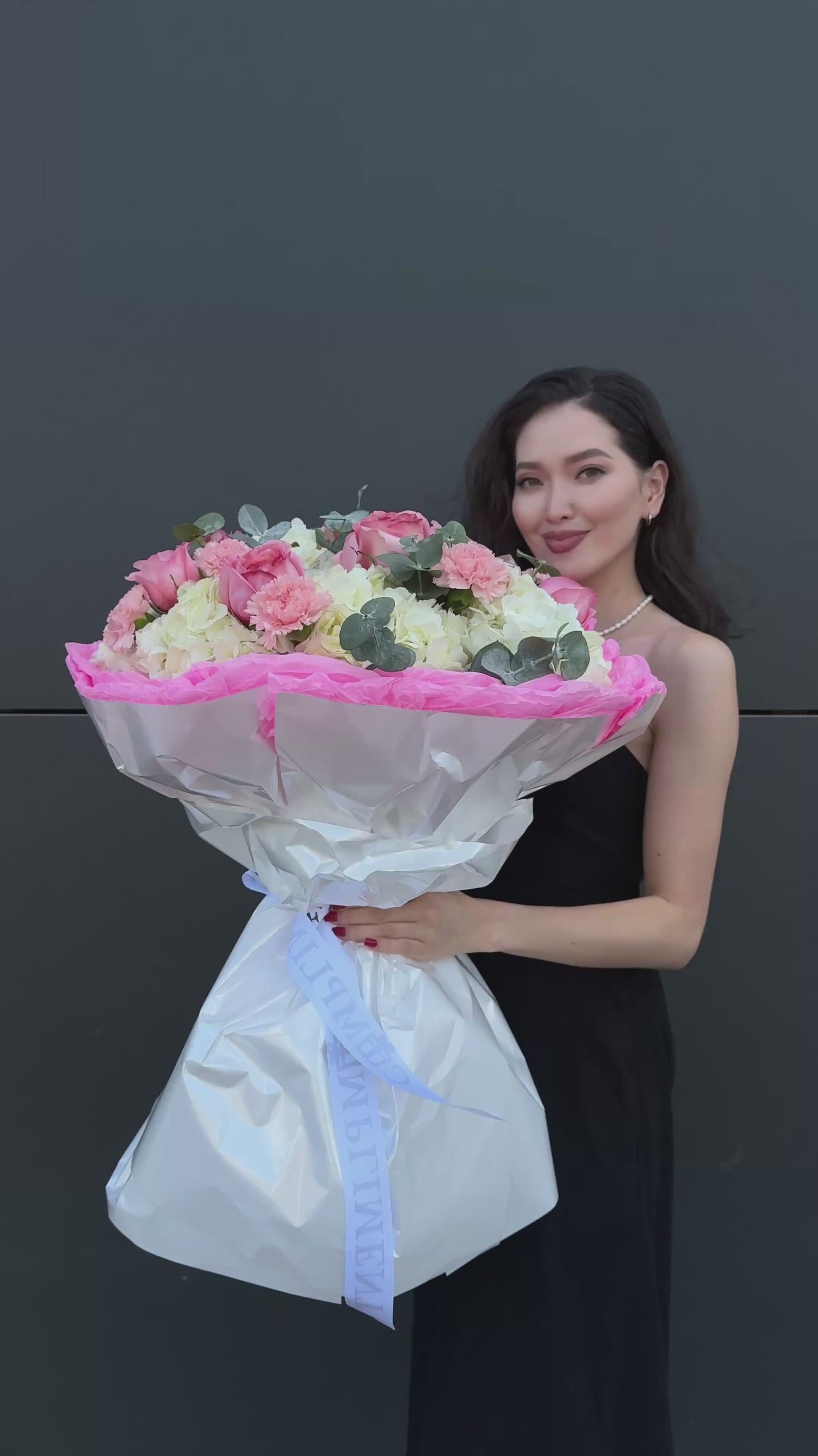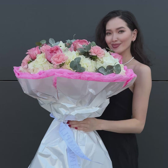Bouquet “PEONY BLOOM” size :M . 15 white hydrangeas , 9 peony roses pink , dianthus & eucalyptus