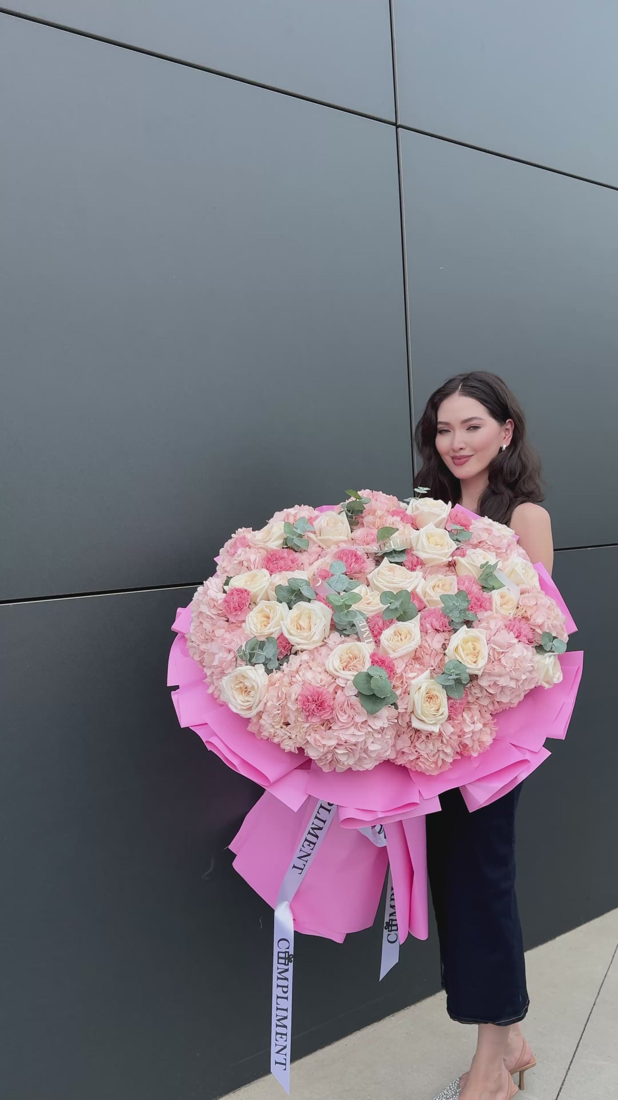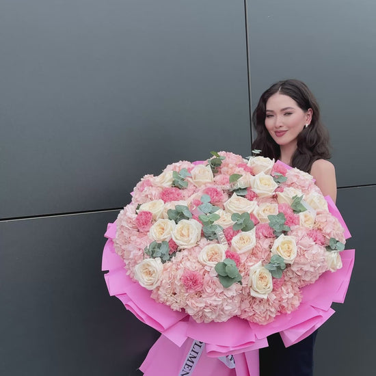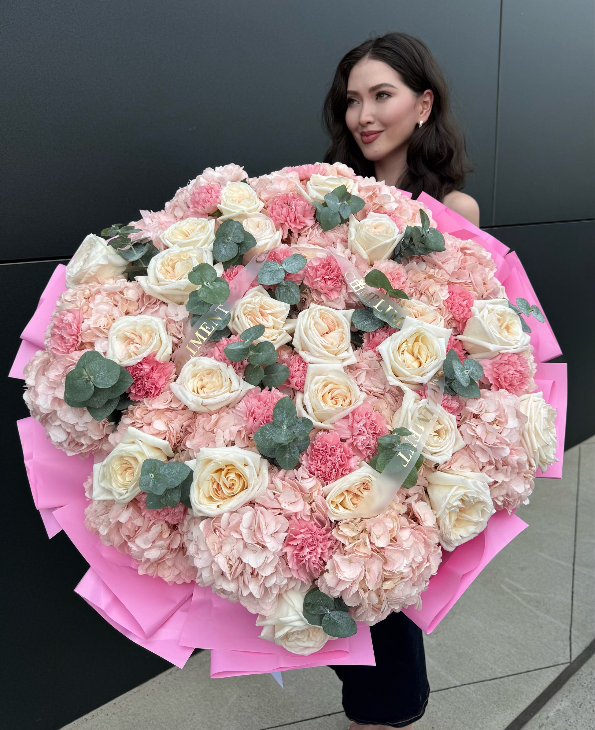 Bouquet “PRINCESS” size : XL . 30 hydrangeas pink , 21 white peony roses ( incredible smell) , 9 carnation ,9 eucalyptus