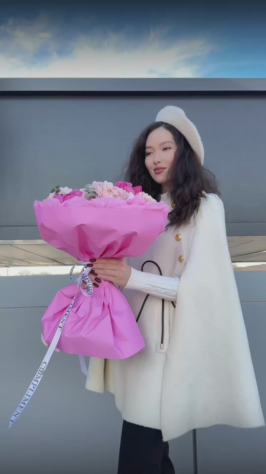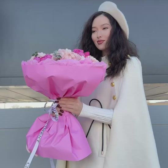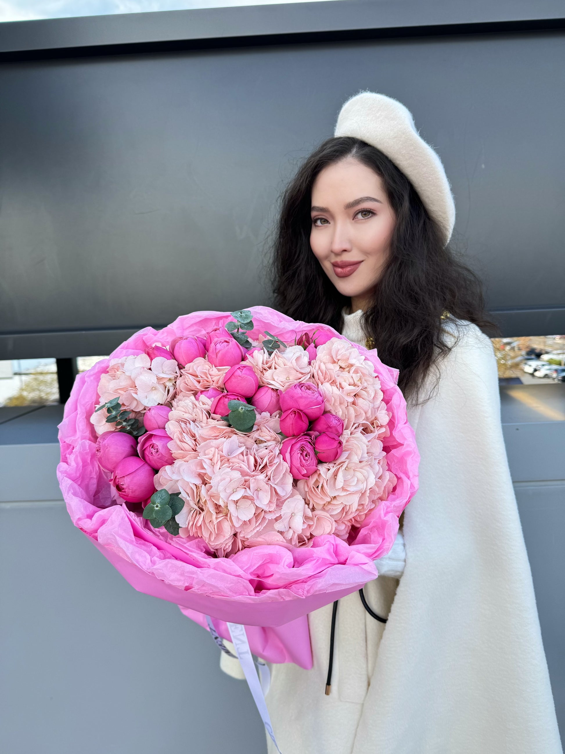 Barbie bouquet size S . Pink hydrangeas , peony spray roses pink & eucalyptus