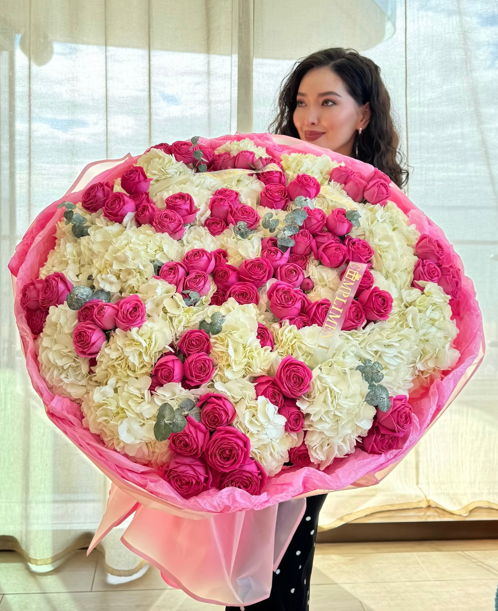 Bouquet with : whire hydrangeas & hot pink peony spray roses& eucalyptus . Size : XL